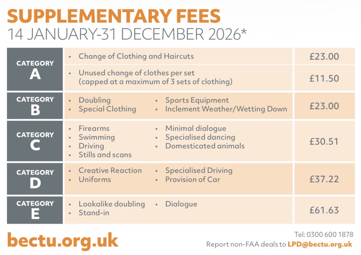 The Standard for most TV and Film productions based in and around London is PACT/FAA. Below you can see a breakdown of these rates and the various supplements applicable for specific work. Including meal penalties and travel allowances.
